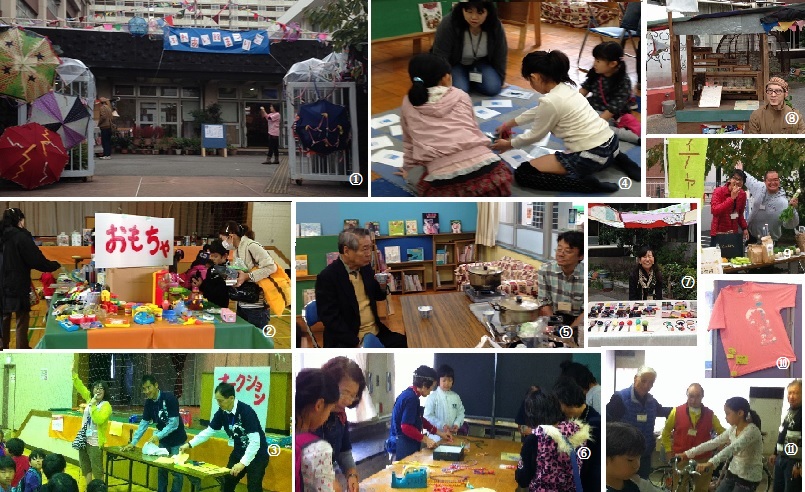①ふれあい館まつりスナップ①不用傘による飾り付け。②おもちゃとみどりのかえっこ。③プログラムに参加し「かえっこ交換券」ゲット。ポイントを使ってオークション。④雨の絵本ひろばの「絵本」神経衰弱ゲーム。⑤雨水市民の会による雨水と水道水の利き茶。墨田区長も参加。⑥すみだリサイクルの会による古着縄ない。⑦不用傘からかわいい小物によみがえる。CASA PROJECTのHOKOさん。⑧水循環を屋台に表現した樋口裕一さん。⑨各地の新鮮野菜とおいしいトークのすみだ青空市ヤッチャバ。⑩まつり実行委員会は久米繊維さん協力によりオリジナルTシャツを販売。⑪自家製自転車こぎ発電を披露する環境ベテランズファーム