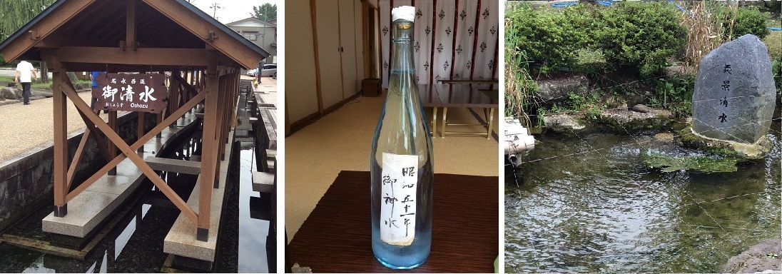 (左)名水百選に選ばれた御清水(おしょうず)。殿様のご用水として使われ、殿様清水ともいわれ、何ともおいしい水だった。 (中)篠座(しのくら)神社の御神水。瓶の底の方が白く見える。 (右)織田信長との戦いで敗れて自害した朝倉義景の墓が近くにあり、義景清水といわれる。