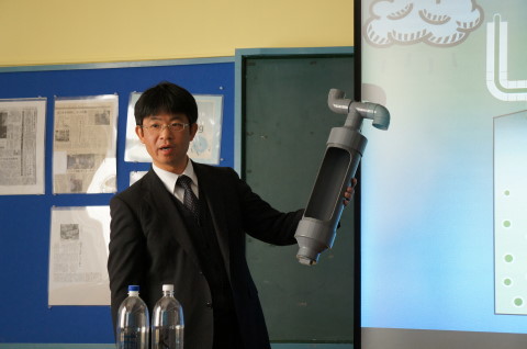 雨水活用では、降り始めの雨を除去することで水質をより良くすることができ、より多くの用途に使用できる。自家製の初期雨水除去装置を披露する笠井講師。