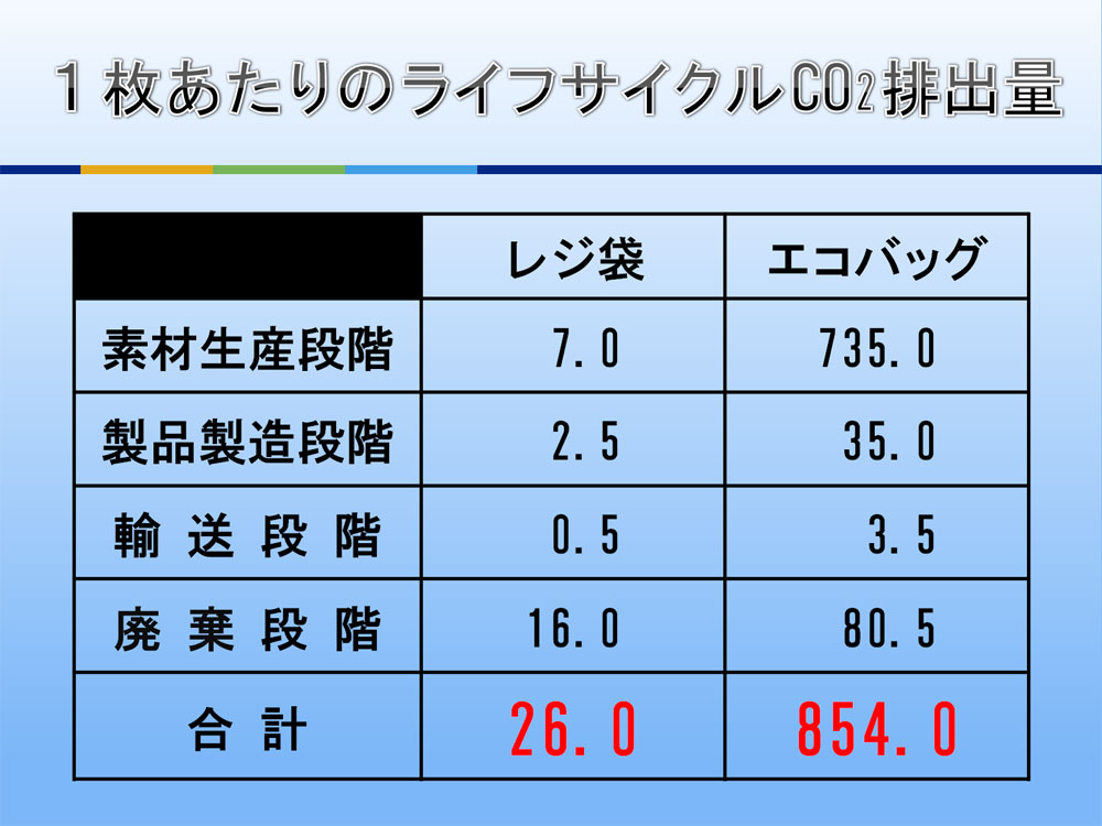 以前、京都の講演でこの話をしたときに、環境団体の会長さんから「環境にやさしいからエコバッグを配ったことがあるのに、まるでエコバッグが悪いようではないか!」と怒られたことがありました。ライフサイクルアセスメントはダメ出しツールではありません。ライフサイクルアセスメントはどこに問題があるかを考えるツールだということです。ですから、ユーザー側の視点からエコバッグを使って本当のエコ活動をしたいのなら、レジ袋に負けないように、使用頻度をさらに上げることを考えればよいのです。一方、エコバッグ製造者の側から考えると、より製造工程を簡略化した製造方法を考える事で全体としての環境負荷量を効果的に低減させることができるということが分かります。