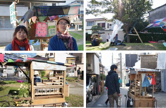 訪れたのは2012年11月3日の午後でした。場所は、市民の会事務局のすぐ近くの一寺言問集会所前広場(墨田区東向島1-20-6)。「墨東まち見世2012 」の参加企画で、樋口裕一さん(スミカ造形美術)とHOUKOさん(CASA PROJECT)の二人が作り出す不思議な空間でした。樋口さんは地元墨田区在住。「古い家に新しく住まう」をテーマに、地産地消にこだわり天然素材や廃材を利用した空間制作を行う。樋口さんは「墨田は雨水活用がさかん。生活と水をテーマに水循環の見える化をしたい」という。